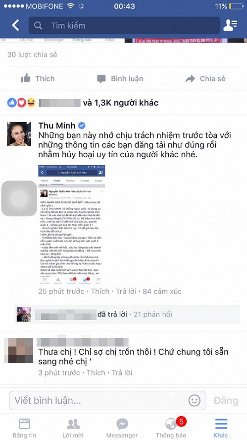 Tuy nhiên, nhiều ý kiến cho rằng tài khoản này đang tìm cách bôi nhọ danh tiếng Thu Minh để thu hút sự chú ý, mưu lợi vì A.H có để lại lời nhắn nhủ 'Mình sẽ cập nhật hình ảnh và tin tức liên tục, bạn nào quan tâm thì theo dõi bài viết minh đăng, xin cảm ơn'.