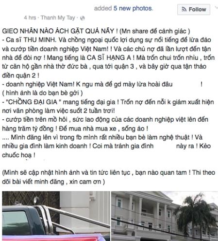 Trên trang cá nhân, A.H viết: 'Ca sỹ Thu Minh và chồng ngoại quốc lợi dụng sự nổi tiếng để lừa đảo và cướp tiền doanh nghiệp Việt Nam! Và các chủ nợ đã lần lượt đến tận nhà để đòi nợ!