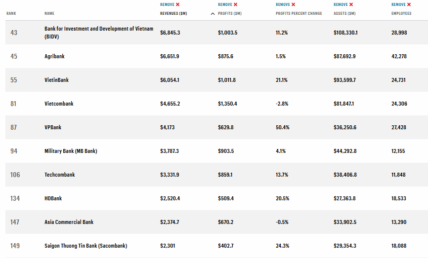 Trong số 76 doanh nghiệp Việt Nam góp mặt, BIDV vươn lên vị trí số 3 tất cả các ngành hàng và dẫn đầu toàn ngành Ngân hàng nội địa về doanh thu, với kết quả vượt mốc 6,8 tỷ USD (tương đương hơn 172 nghìn tỷ VND). Đồng thời, với kết quả này, BIDV hiện đứng thứ 11 trong số các ngân hàng khu vực Đông Nam Á.