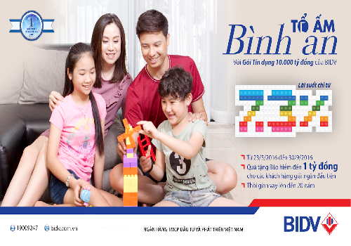 HOANHAP.VN - Nhằm hỗ trợ tích cực, hiệu quả cho khách hàng cá nhân vay nhu cầu nhà, từ 09/05/2016 đến 30/09/2016, Ngân hàng TMCP Đầu tư và Phát triển Việt Nam - BIDV triển khai Chương trình “Tổ ấm Bình An 2016” với nhiều ưu đãi hấp dẫn, quy mô tổng nguồn vốn lên đến 10.000 tỷ đồng và thời gian vay lên đến 20 năm.