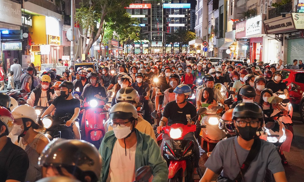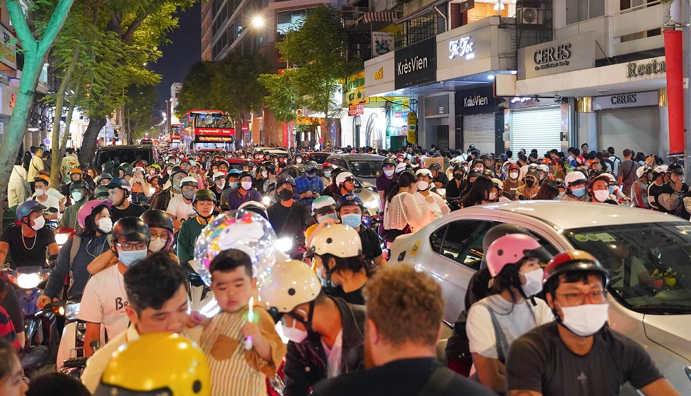 Sau chương trình bắn pháo hoa, dòng người rời Quận 1, tình trạng giao thông tại các tuyến đường trung tâm gặp tình trạng ùn ứ tạm thời.