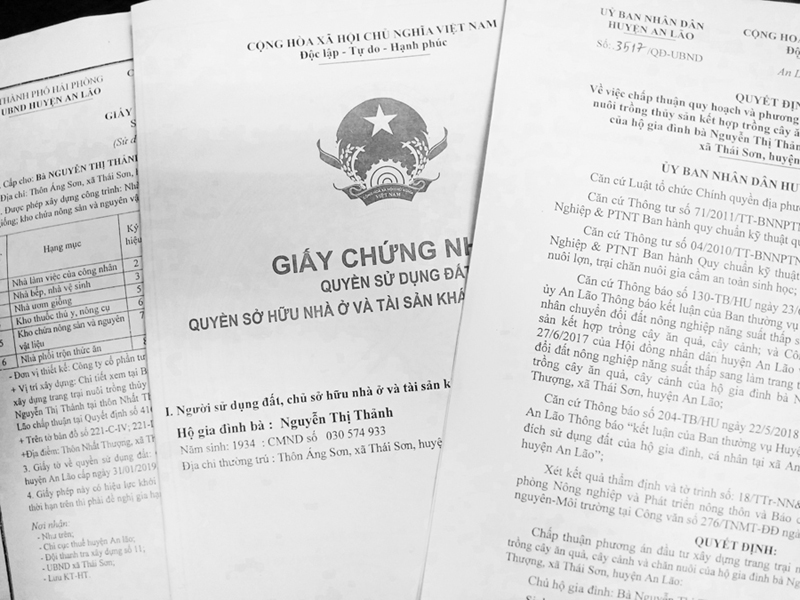 Ngày 31/1/2019, UBND huyện An Lão cấp Giấy chứng nhận quyền sử dụng đất, quyền sở hữu nhà ở và tài sản khác gắn liền trên đất cho hộ gia đình bà Nguyễn Thị Thảnh thôn Áng Sơn, xã Thái Sơn, huyện An Lão, TP Hải Phòng; diện tích 39.794,0m2 với mục đích sử dụng: Trang trại nuôi trồng thủy sản kết hợp trồng cây ăn quả, cây cảnh thời hạn sử dụng 46 năm. Nguồn gốc sử dụng: Thuê đất, chuyển mục đích sử dụng đất theo Quyết định số 4448/QĐ-UBND ngày 14/12/2108 và Quyết định số 4181/QĐ-UBND ngày 9/11/2018 của UBND huyện An Lão về việc cho phép thuê đất, chuyển mục đích sử dụng đất.