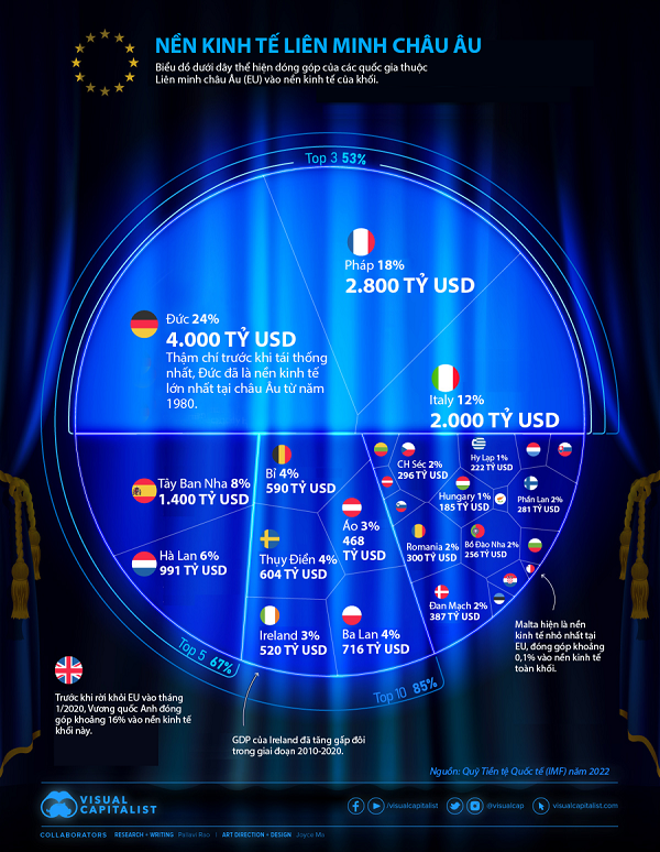 Dưới đây là đóng góp của 27 quốc gia thành viên vào nền kinh tế EU.