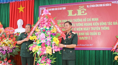 Đại tướng Phùng Quang Thanh - Nguyên Bộ Trưởng Bộ Quốc phòng tặng hoa Thiếu tướng Hoàng Kiền tại Lễ Tôn vinh Giải thưởng Hồ Chí Minh về đề tài: Xây dựng các công trình phòng thủ trên quần đảo Trường Sa.
