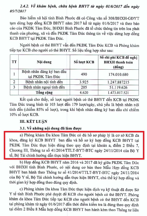 Bộ Y tế đã kết luận phòng khám Tâm Đức có đủ hồ sơ pháp lý là cơ sở KCB BHYT ban đầu. Và BHXH tỉnh Bình Phước tạm dừng hợp đồng khám bệnh, chữa bệnh bảo hiểm y tế đối với Phòng khám đa khoa Tâm Đức là trái với quy định pháp luật. Đồng thời BHXH Bình Phước chưa thanh toán số tiền hơn 5 tỷ đồng chi phí KCB BHYT trong năm 2016 là không đúng với các quy định của pháp luật.