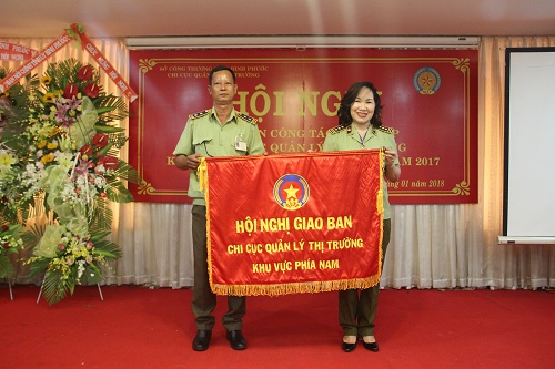 | Bà Phạm Thị Ngọc - Chi cục trưởng chi cục QLTT tỉnh Bình Phước trao cờ luân phiên đăng cai hội nghị cho Chi cục trưởng chi cục QLTT tỉnh Hậu Giang. |