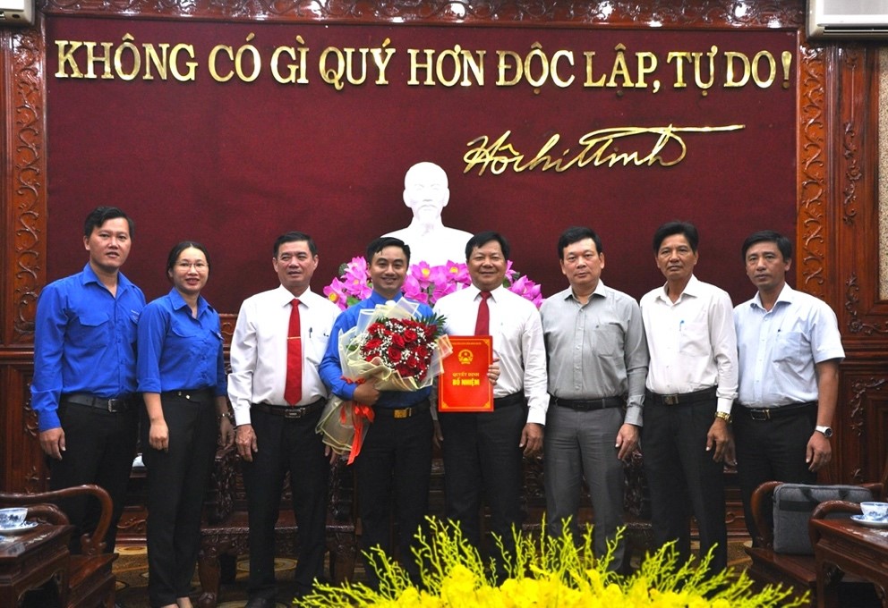 Phó Chủ tịch UBND tỉnh Trần Văn Mi (bên phải) trao quyết định bổ nhiệm Giám đốc Trung tâm Xúc tiến đầu tư thương mại và du lịch tỉnh đối với anh Trần Quốc Duy.