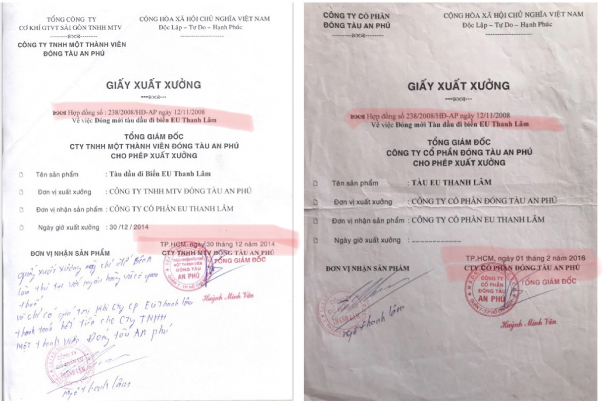 Hồ sơ lưu tại Chi cục Thủy sản Bình Thuận mà chúng tôi được cung cấp. Trong đó, quyết định đóng mới tàu cá được sở Nông nghiệp và phát triển Nông thôn Bình Thuận cấp cho công ty cổ phần quốc tế EU Thanh Lam vào ngày 16/11/2011. Hợp đồng đóng tàu dầu 238 giữa công ty đóng tàu An Phú và công ty TNHH Thương mại chế biến hải sản Thanh Lâm. Và biên lai nộp thuế trước bạ của công ty cổ phần EU Thanh Lam.