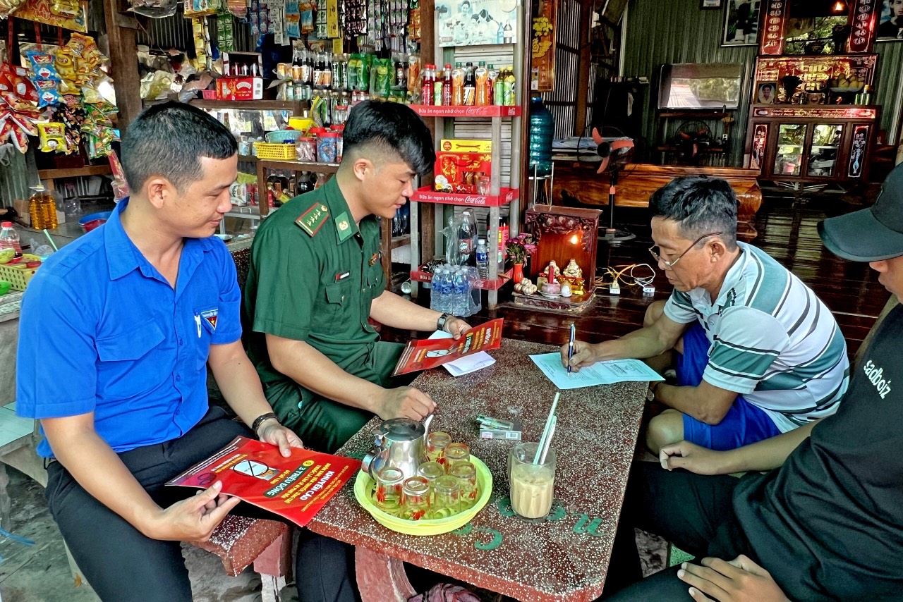 Cán bộ, chiến sĩ Đồn Biên phòng Phú Hội phối hợp với Đoàn Thanh niên địa phương hướng dẫn nhân dân viết cam kết phòng, chống buôn lậu thuốc lá