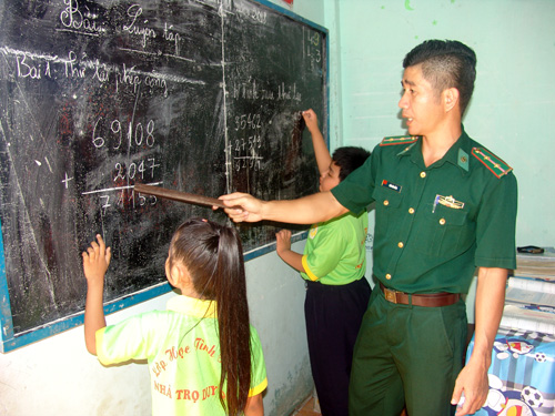 Khác với thầy Cảnh, thầy Thái là “dân trong nghề”. Trước khi nhập ngũ, anh tốt nghiệp Trường CĐ Sư phạm Đồng Tháp và có thời gian đứng lớp: “Trước đây tôi dạy cấp 2. Những ngày đầu dạy cấp 1 tại lớp học tình thương này, tôi rất bỡ ngỡ, rồi quen dần. Thấy các em khó khăn, tôi thương lắm, sẽ hết lòng giúp các em biết con chữ”.
