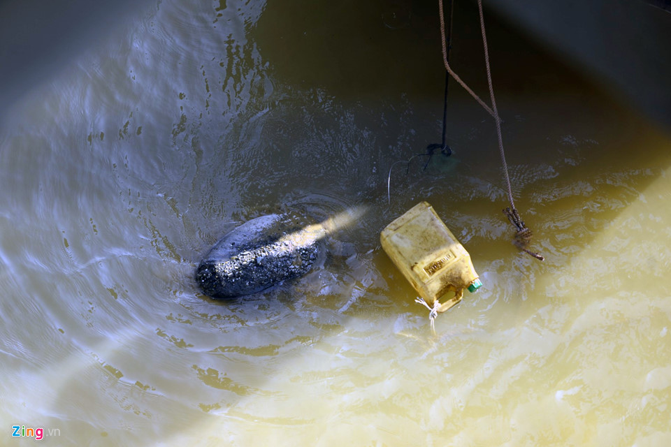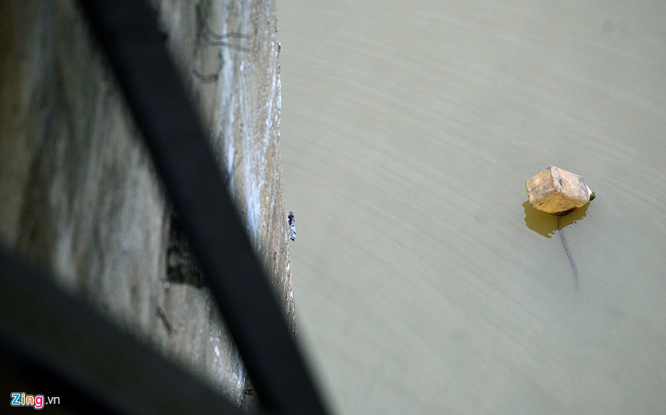 Chiếc can nhựa nổi đánh dấu khu khu vực có bom gần trụ P13 cầu Long Biên. Bộ tư lệnh Công binh thực hiện và xác định quả bom dài khoảng 2-2,2 m, đường kính 60 cm, nằm sâu dưới mực nước khoảng hơn 5 m.
