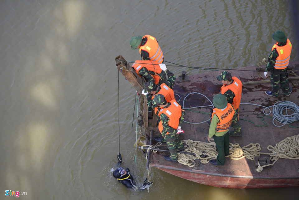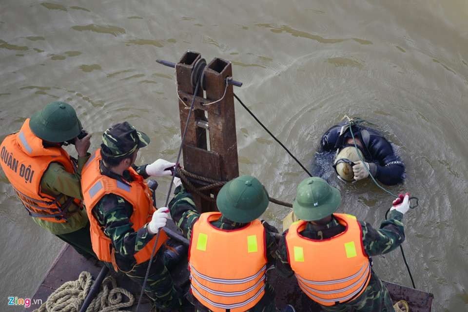Vào lúc 13h45, người nhái đã tiếp cận được quả bom, chuẩn bị tiến hành trục vớt.