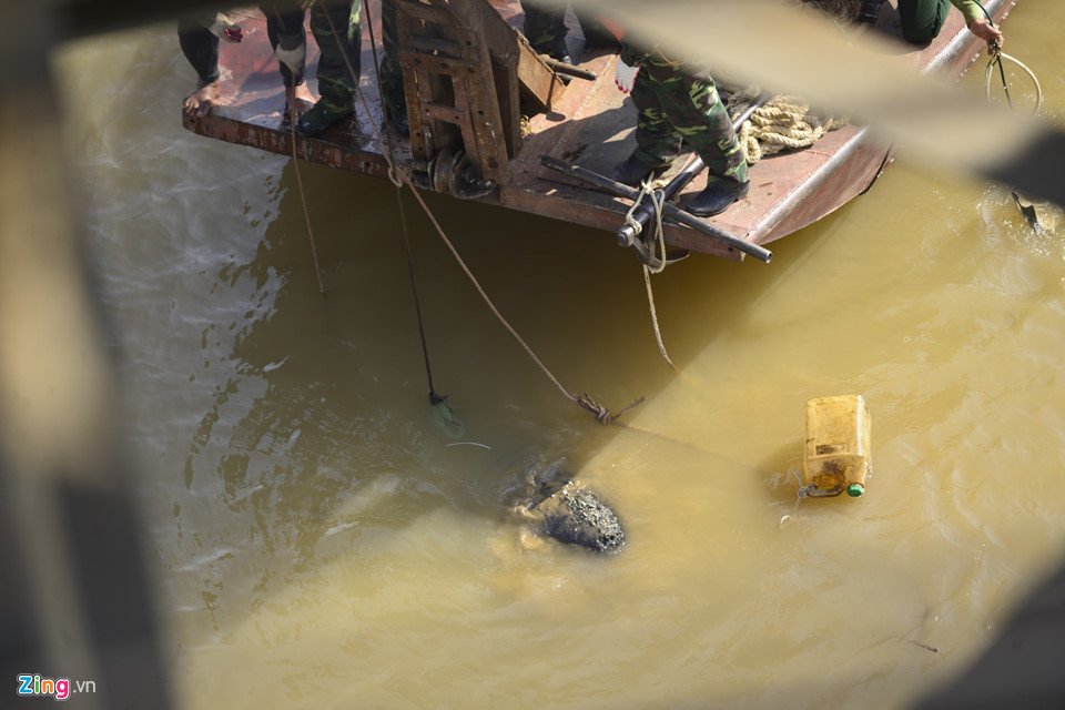 Quả bom nhô lên khỏi mặt nước lúc 14h10. Dự kiến một chiếc cẩu khoảng 20 tấn sẽ đưa bom từ dưới nước lên xe chuyên dụng.