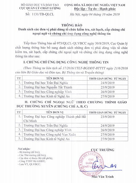 Trong Thông báo do Cục trưởng Cục Quản lý chất lượng (Bộ GD-ĐT) Mai Văn Trinh ký ngày 4/10/2019 đã nêu tên 6 trường Đại học phải dừng việc tổ chức kiểm tra, sát hạch, cấp chứng chỉ ngoại ngữ và chứng chỉ ứng dụng công nghệ thông tin.