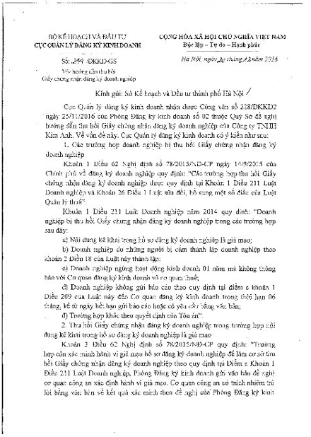 Tại văn bản chỉ đạo số 6021/UBND-ĐT ngày 19/10/2016 do ông Nguyễn Quốc Hùng - Phó Chủ tịch UBND thành phố Hà Nội ký ban hành, có nêu: “Xét báo cáo, đề nghị của Thanh tra thành phố tại văn bản số 1881/TTTP-P1 ngày 4/7/2016; Sở Kế hoạch và Đầu tư tại văn bản số 1073/BC-KH&ĐT ngày 6/9/2016; Công an thành phố tại văn bản số 686/BC-CAHN-PC46 ngày 14/9/2016 về việc thu hồi Giấy chứng nhận đăng ký kinh doanh lần thứ 5 cho Công ty TNHH Kim Anh, UBND thành phố chỉ đạo như sau: Sở Kế hoạch và Đầu tư thu hồi Giấy chứng nhận ĐKKD lần thứ 5 đã cấp cho Công ty TNHH Kim Anh”.