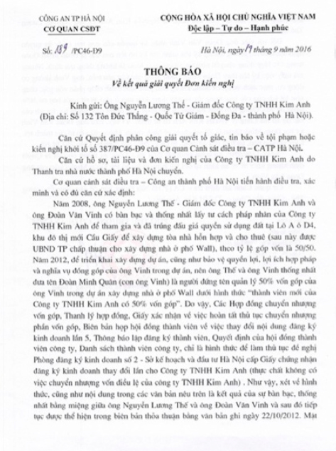Cụ thể, thực hiện chỉ đạo của Chủ tịch UBND thành phố tại Văn bản số 6636/VP-NC ngày 02/8/2016 của Văn phòng UBND Thành phố, Công an Thành phố Hà Nội đã tiến hành điều tra, xác minh lại toàn bộ hồ sơ vụ việc của Công ty TNHH Kim Anh và đã có các văn bản: Báo cáo số 686/BC-CAHN ngày 14/9/2016 báo cáo Chủ tịch UBND thành phố kết quả giải quyết đơn của Công ty TNHH Kim Anh; Thông báo số 188/PC46-Đ9 ngày 14/9/2016 gửi Sở Kế hoạch và Đầu tư về kết quả giải quyết đơn của Công ty TNHH Kim Anh. Kết quả điều tra, xác minh cơ bản của Công an Thành phố Hà Nội nêu như sau: