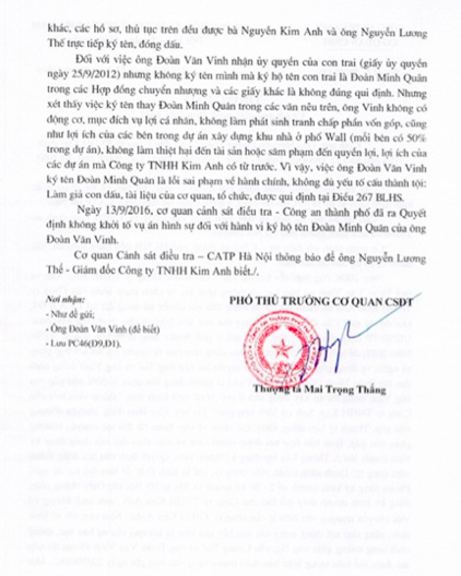 + Trong các văn bản nêu trên, Công an thành Hà Nội đã kết luận rõ: “Việc ông Đoàn Văn Vinh nhận ủy quyền của con trai Đoàn Minh Quân nhưng lại không kỷ tên của mình mà ký tên con trai trong cảc tài liệu của hồ sơ thay đổi ĐKDN là không đúng quy định. Nhưng xét thấy việc ký tên thay Đoàn Minh Quân trong các tài liệu của hồ sơ ông Vinh không vì động cơ, mục đích vụ lợi cá nhân, không làm làm phát sinh tranh chấp phần vốn góp cũng như lợi ích của các bên trong Dự án xây dựng Khu nhà ở phố Wall (mỗi bên có 50% trong dự án), không làm thiệt hại đến tài sản hoặc xâm phạm đến quyền lợi, lợi ích của các dự án mà Công ty TNHH Kim Anh có từ trước. Vì vậy, việc ông Đoàn Văn Vinh ký tên Đoàn Minh Quán là lỗi sai phạm về hành chính, không đủ yếu tố cấu thành tội: Làm giả con dấu, tài liệu của cơ quan, tổ chức được quy định tại Điều 267 BLHS .”
