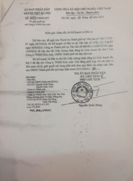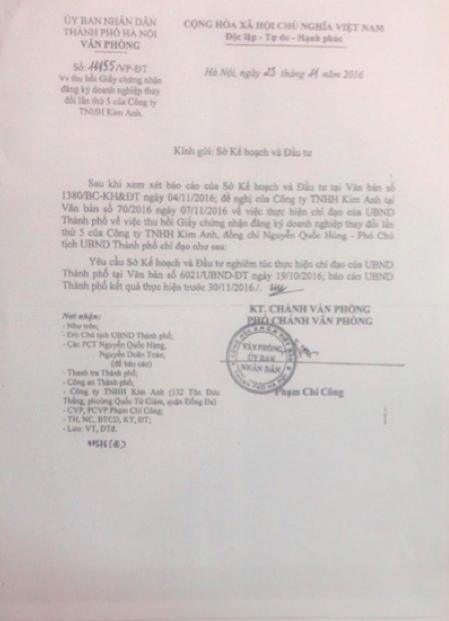 Sau đó, ngày 23/11/2016, ông Phạm Chí Công - Phó Chánh Văn phòng UBND thành phố Hà Nội lại tiếp tục ban hành Văn bản số 11155/VP-ĐT yêu cầu: “Sau khi xem xét báo cáo của Sở Kế hoạch và Đầu tư tại văn bản số 1380/BC-KH&ĐT ngày 4/11/2016; đề nghị của Công ty TNHH Kim Anh tại văn bản số 70/2016 ngày 7/11/2016 về việc thực hiện chỉ đạo của UBND Thành phố về việc thu hồi Giấy chứng nhận đăng ký doanh nghiệp thay đổi lần thứ 5 của Công ty TNHH Kim Anh, đồng chí Nguyễn Quốc Hùng - Phó Chủ tịch UBND Thành phố chỉ đạo như sau: Yêu cầu Sở Kế hoạch và đầu tư nghiêm túc thực hiện chỉ đạo của UBND Thành phố tại văn bản số 6021/UBND-ĐT ngày 19/10/2016, báo cáo UBND Thành phố kết quả thực hiện trước ngày 30/11/2016”.