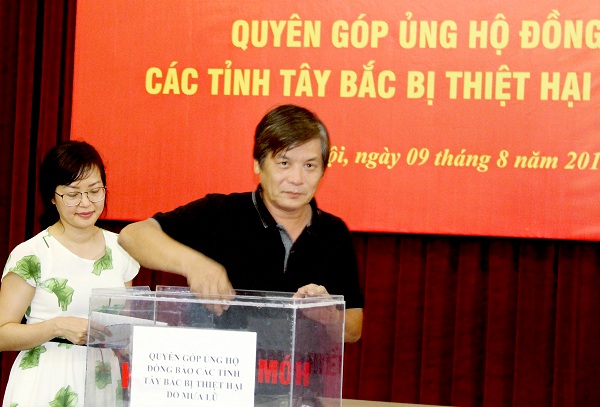 | Tại lễ phát động, Báo Lao động và Xã hội ủng hộ đồng bào lũ lụt 12 triệu đồng. |