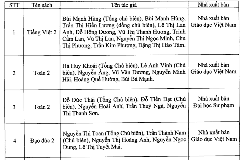 Danh mục SGK lớp 2 gồm 19 cuốn ở 8 môn học và hoạt động giáo dục (gồm cả bắt buộc và tự chọn). Trong đó, Tiếng Việt, Âm nhạc, Hoạt động trải nghiệm mỗi môn có 1 cuốn; Toán, Đạo đức, Tự nhiên Xã hội, Giáo dục thể chất mỗi môn 2 cuốn và môn tự chọn là Tiếng Anh có 6 đầu sách.