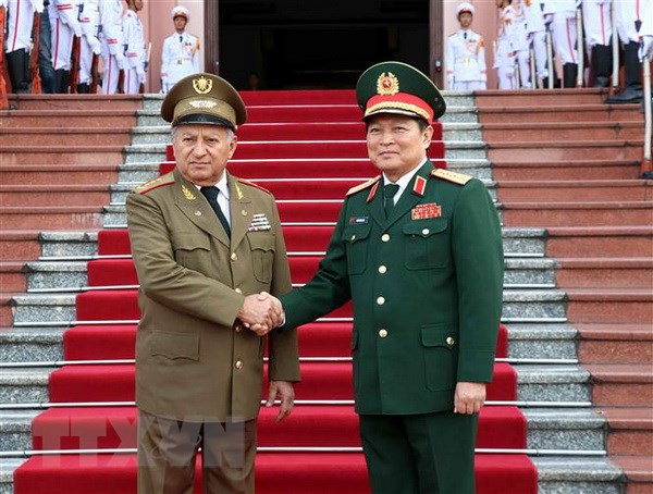 | Bộ trưởng Bộ Quốc phòng Ngô Xuân Lịch đón Bộ trưởng Bộ các Lực lượng vũ trang cách mạng Cuba Leopoldo Cintra Frías. (Ảnh: Văn Điệp/TTXVN) |