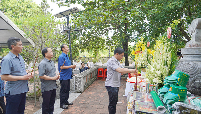 Bộ trưởng Bộ GTVT Nguyễn Văn Thắng và Chủ tịch UBND tỉnh Trần Thắng; thành viên đoàn công tác Bộ GTVT dâng hương tại nghĩa trang liệt sỹ Cục công trình ở xã Xuân Ninh (Quảng Ninh)