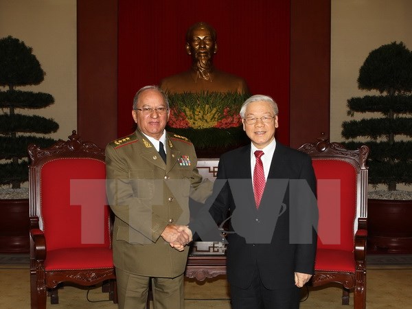 | Tổng Bí thư Nguyễn Phú Trọng tiếp Thượng tướng Leopoldo Cintra Frias, Ủy viên Bộ Chính trị, Ủy viên Hội đồng Nhà nước, Bộ trưởng Bộ các lực lượng vũ trang Cách mạng Cuba trong chuyến thăm hữu nghị chính thức Việt Nam vào năm 2014. (Ảnh: Trí Dũng/TTXVN) |