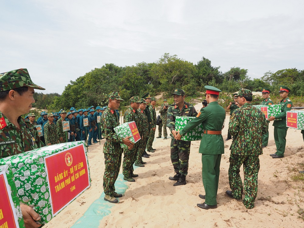 Đại tá Lê Xuân Thế - Phó Tư lệnh, Tham mưu trưởng Bộ Tư lệnh Thành phố Hồ Chí Minh trao quà cho các đơn vị tham gia diễn tập.