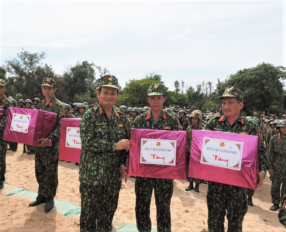 Trung tướng Trần Hoài Trung - Bí thư Đảng Ủy, Chính ủy Quân khu 7 trao quà cho các đơn vị tham gia diễn tập.