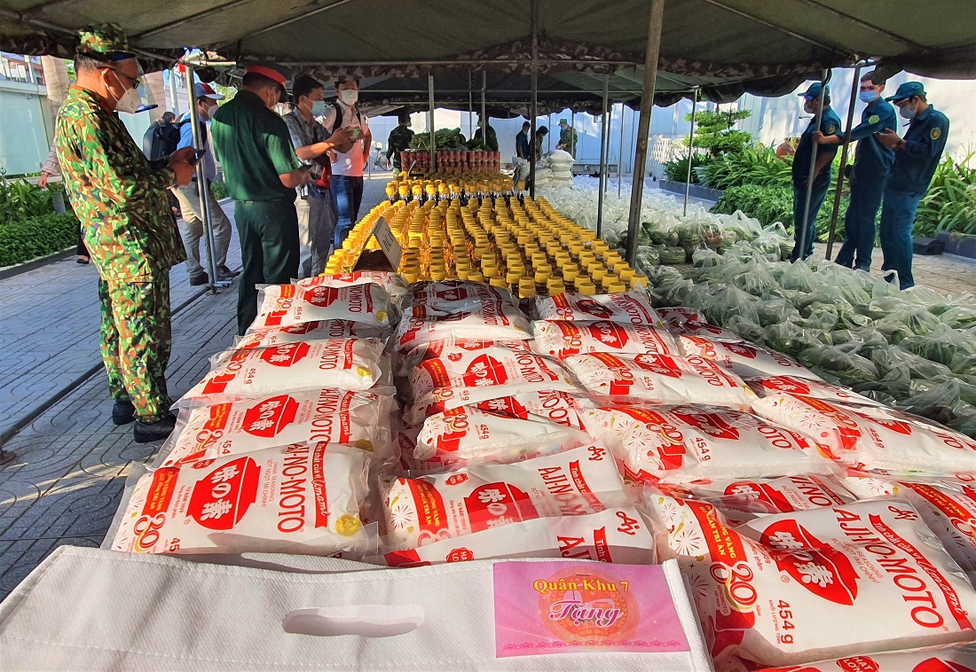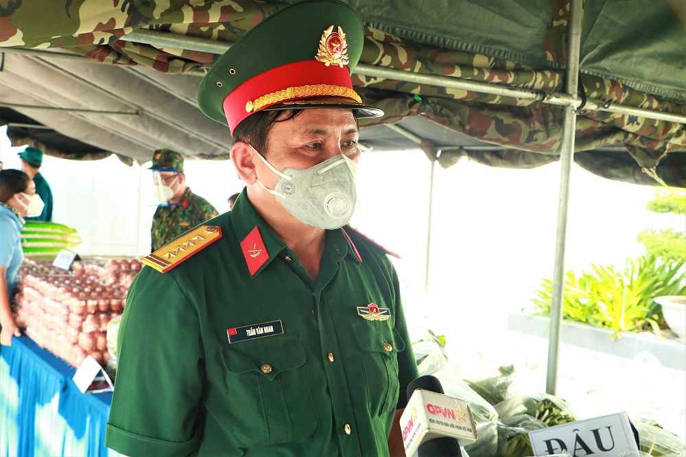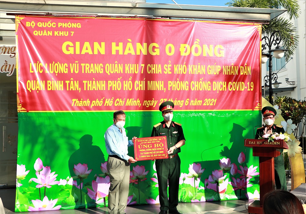 “Bộ Tư lệnh Quân khu 7 tổ chức chương trình “Gian hàng 0 đồng” để chia sẻ phần nào những khó khăn của bà con nhân dân bị ảnh hưởng bởi dịch bệnh Covid-19. Bằng những sản phẩm tăng gia sản xuất của những chiến sĩ lực Lực lượng vũ trang Quân khu 7 trồng tại Sư đoàn 5 (Tây Ninh) và Đoàn kinh tế quốc phòng Lâm Đồng. Các cán bộ chiến sĩ đã vận chuyển số rau củ đến đây để tặng cho bà con người dân, mong rằng mọi người cố gắng, chung tay nghĩa tình hỗ trợ nhau để vượt qua dịch bệnh” – Đại tá Trần Văn Hoan chia sẻ.