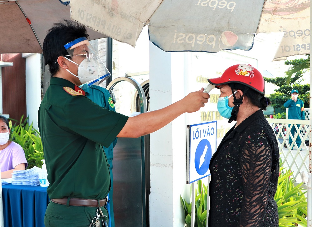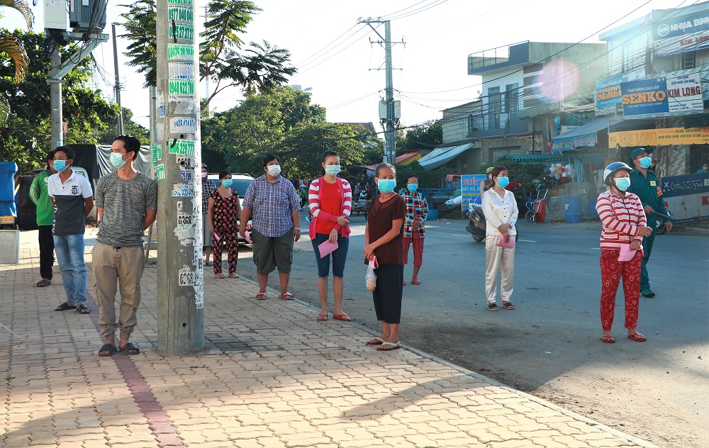 Để đảm bảo an toàn và hiệu quả trong công tác phòng chống dịch Covid-19, người dân đến nhận quà phải tuân thủ việc giữ khoảng cách, đo thân nhiệt, đeo khẩu trang...