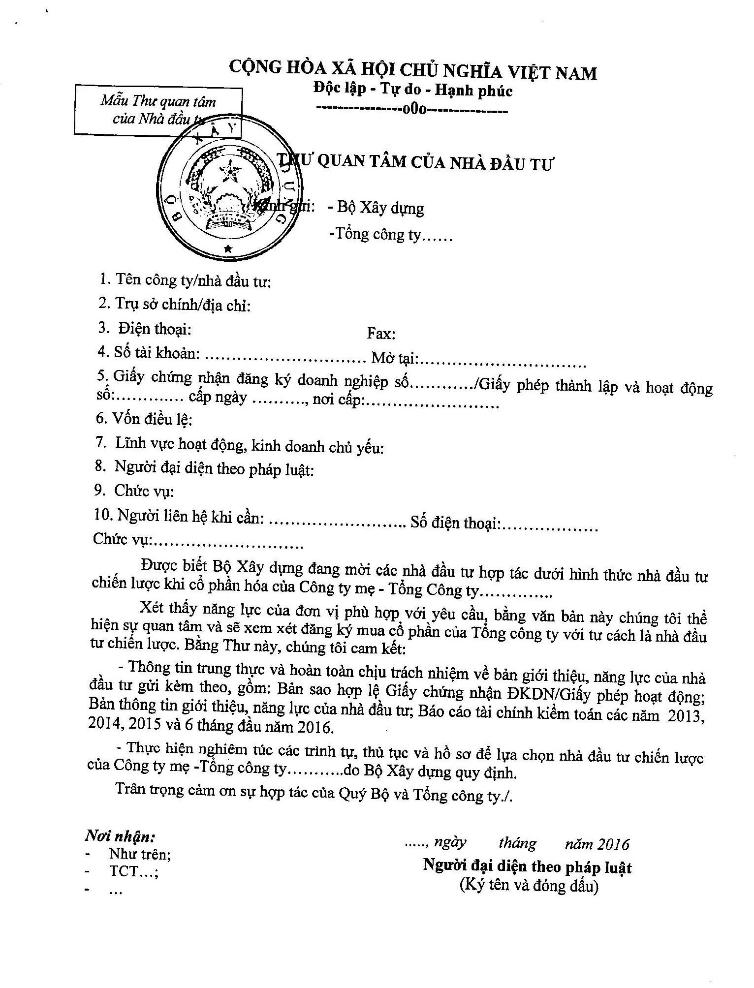 Mẫu thư để nhà đầu tư gửi đến doanh nghiệp có mong muốn trở thành nhà đầu tư chiến lược.