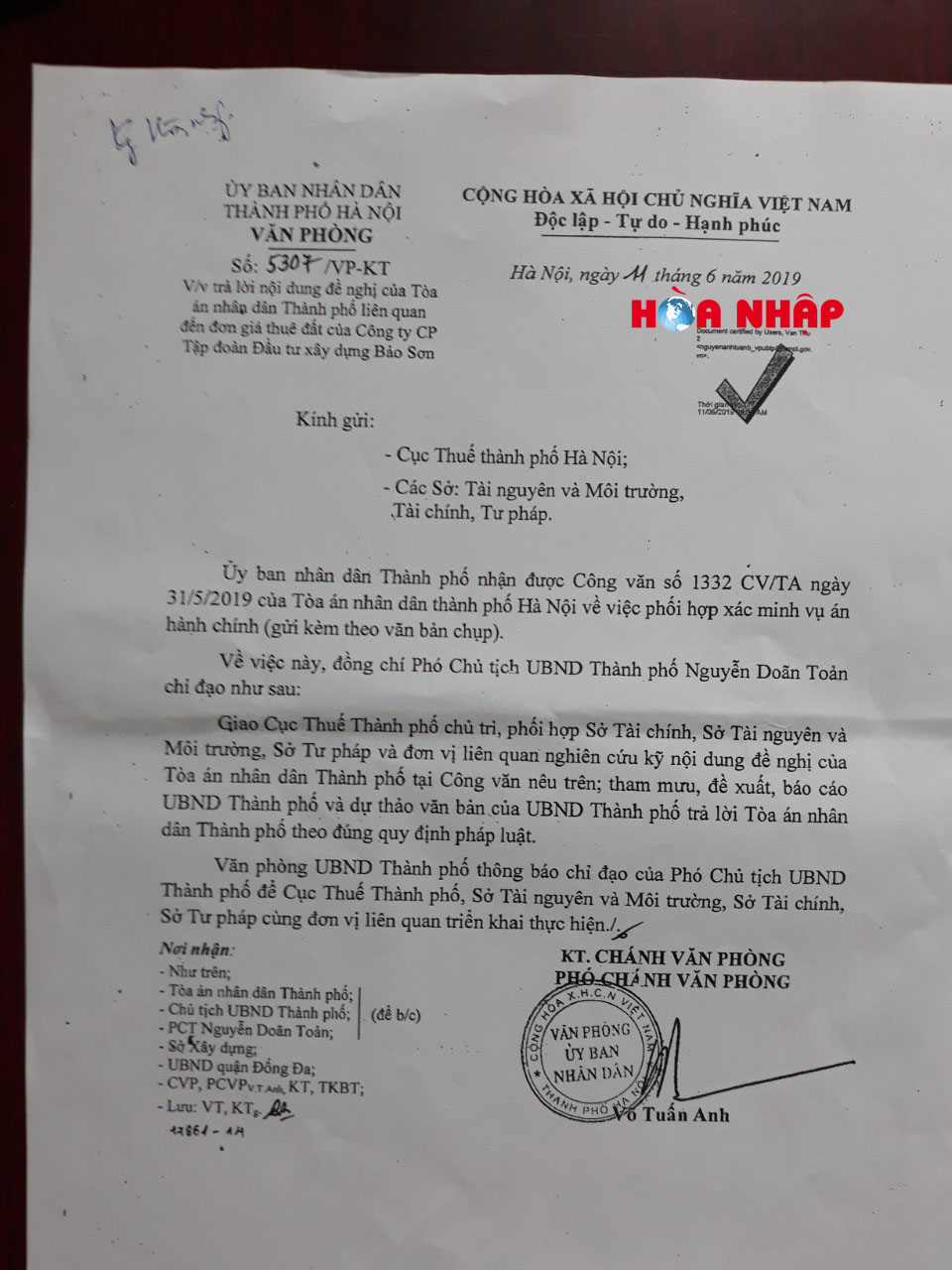 Ngày 31/8/2018, Viện KSND TP Hà Nội cũng đã có Văn bản 3308/BT-VKS-P10 gửi Tập đoàn Bảo Sơn, nói rõ vụ việc kéo dài vụ án của Tòa Hành chính - TAND TP Hà Nội là vi phạm luật tố tụng. Theo Viện KSND TP Hà Nội, cơ quan này cũng đã có Kiến nghị số 08 gửi TAND TP Hà Nội về vụ việc này.