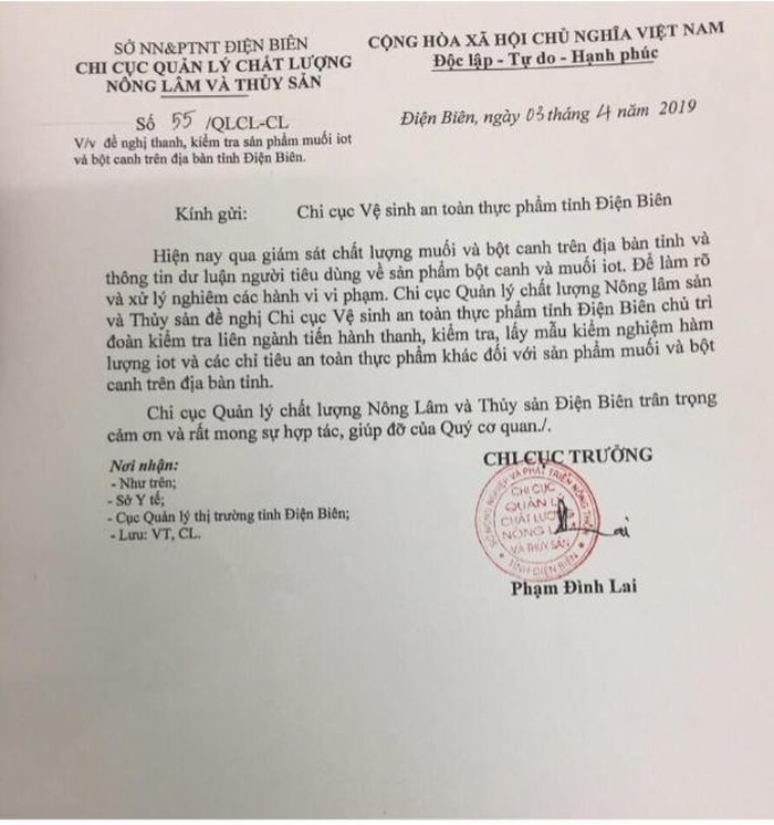 | Văn bản đề nghị thanh, kiểm tra sản phẩm muối iot và bột canh trên địa bàn tỉnh Điện Biên - Ảnh: Internet |