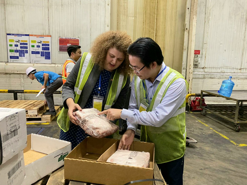 Bà Sarah Gilleski – Quyền Tham tán nông nghiệp, Đại sứ quán Hoa Kỳ tại Việt Nam và Ông Nguyễn Thái Dũng – Tổng giám đốc công ty TNHH Bán lẻ BRG kiểm tra công-ten-nơ thịt heo nhập khẩu từ Mỹ.