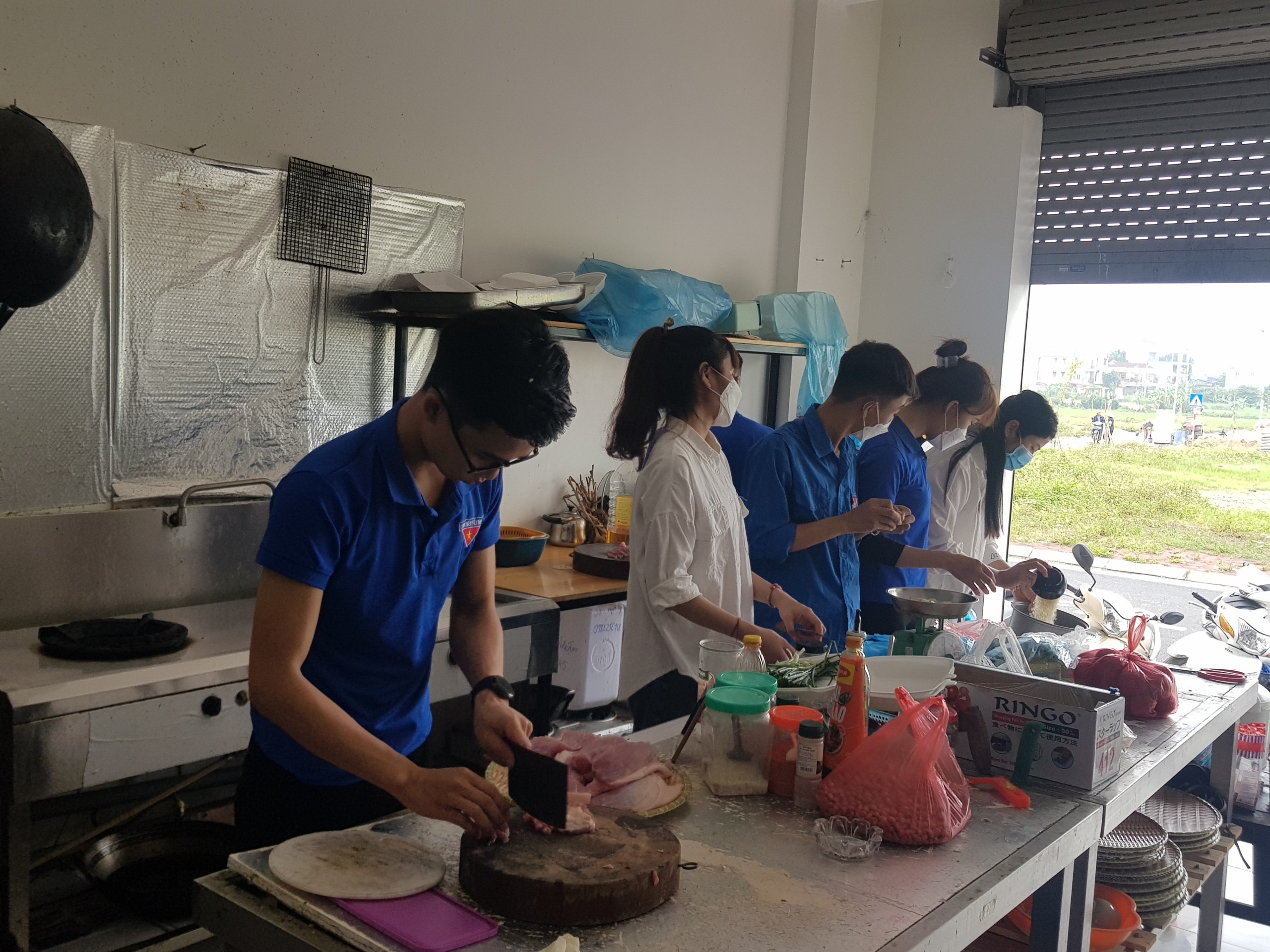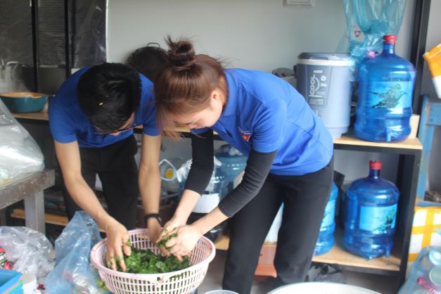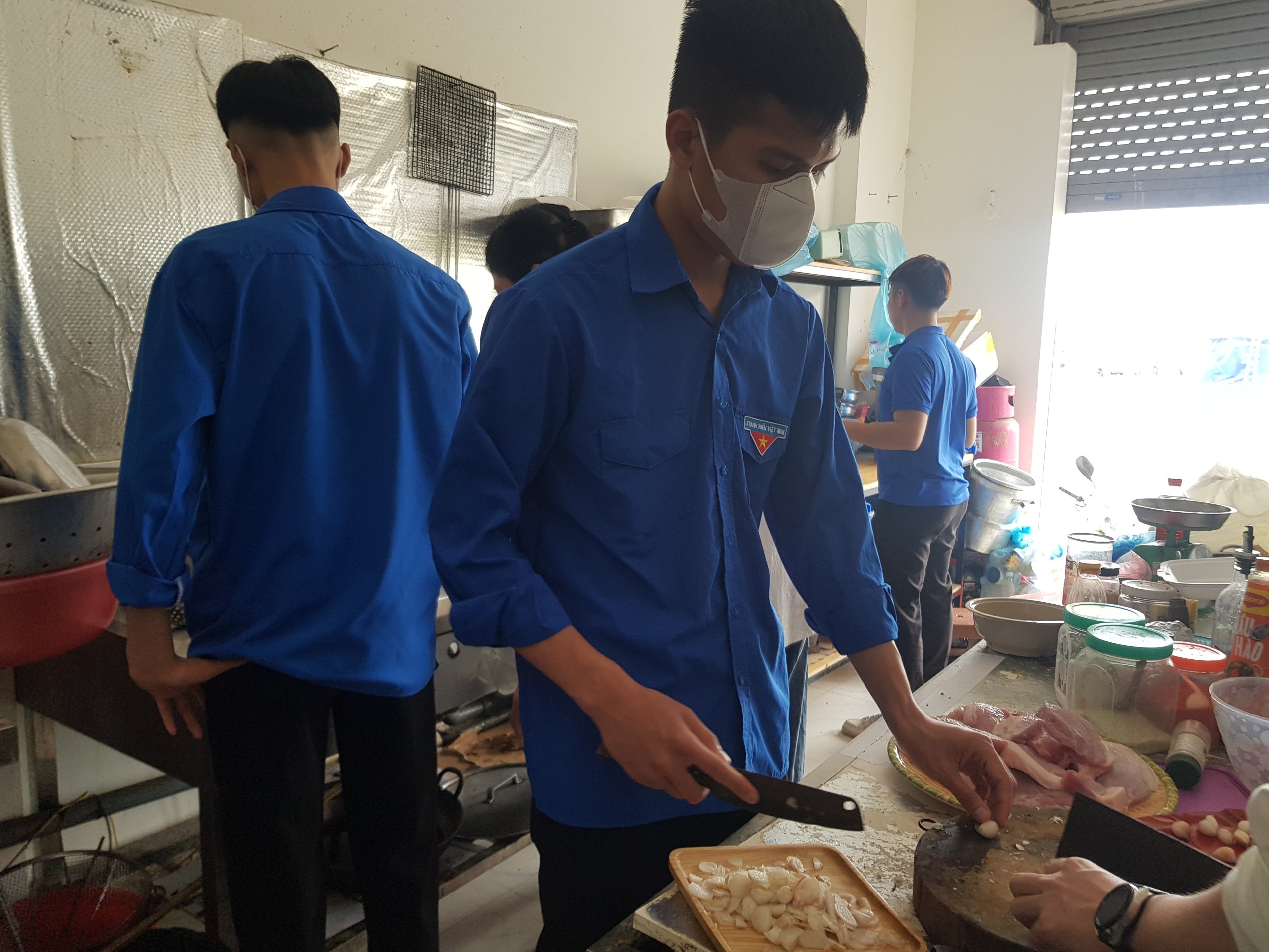 Từ 7h sáng các thành viên của CLB Hành trình Nhiệt huyết, Đoàn viên, Thanh niên của Đoàn thanh niên Công an huyện Sóc Sơn và Đoàn Thanh niên Bệnh viên Đa khoa Sóc Sơn tất bật nấu cơm cho bệnh nhân.