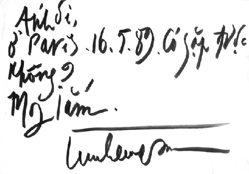 | Ảnh chụp lá thư vừa được tìm thấy của Trịnh Công Sơn với nội dung: ''Ánh ơi, Ở Paris. 16.5.89. Có gặp được không? Mong lắm''. |