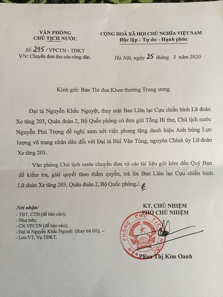 Công văn số 295/VPCTN-TĐKT ngày 25/3/2020 của Văn phòng Chủ tịch nước gửi Ban Thi đua khen thưởng Trung ương