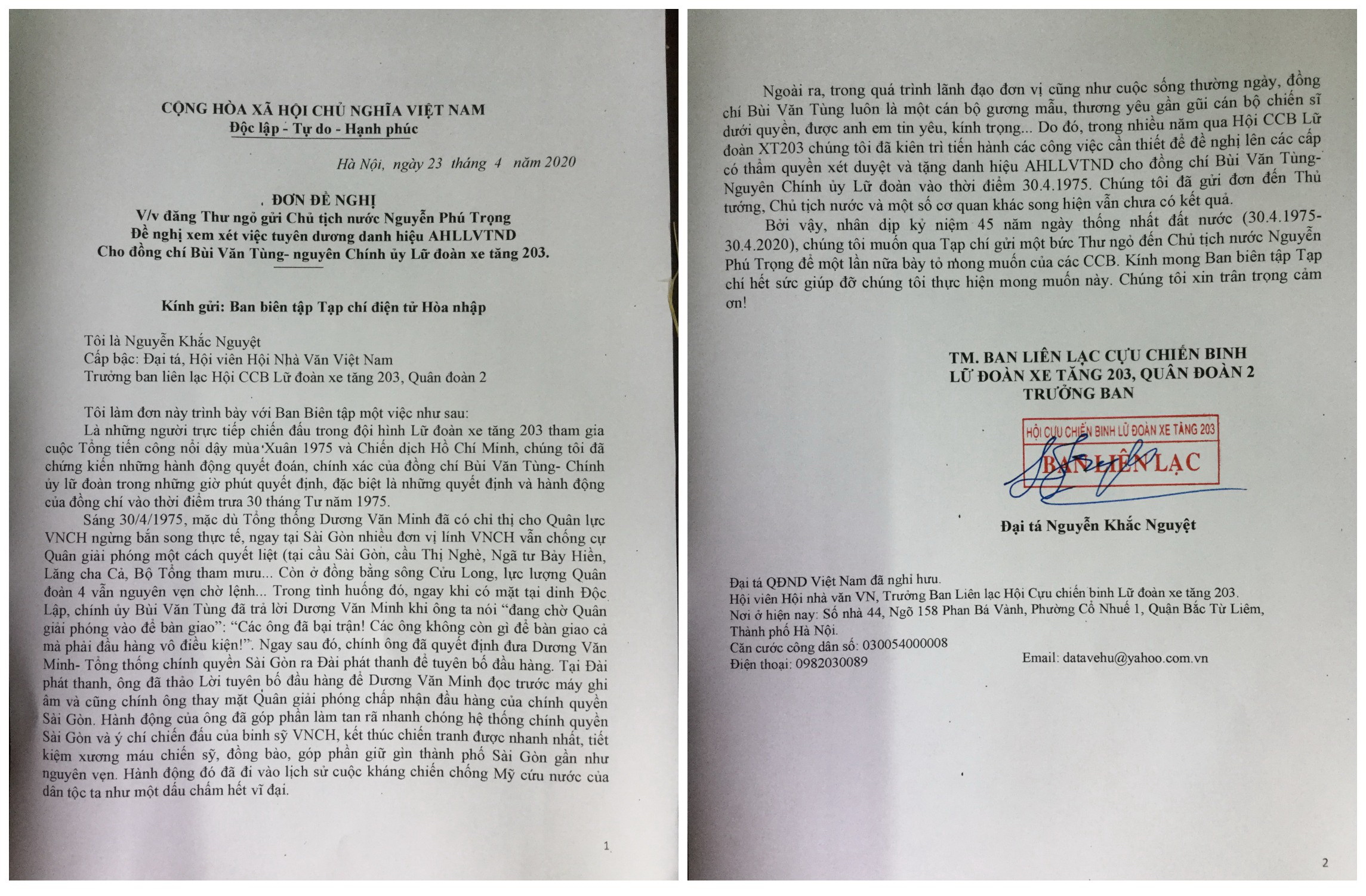 Đơn đề nghị của Đại tá Nguyễn Khắc Nguyệt, Trưởng ban liên lạc Hội CCB Lữ đoàn xe tăng 203, Quân đoàn 2 gửi Ban Biên tập ngày 23/4/2020