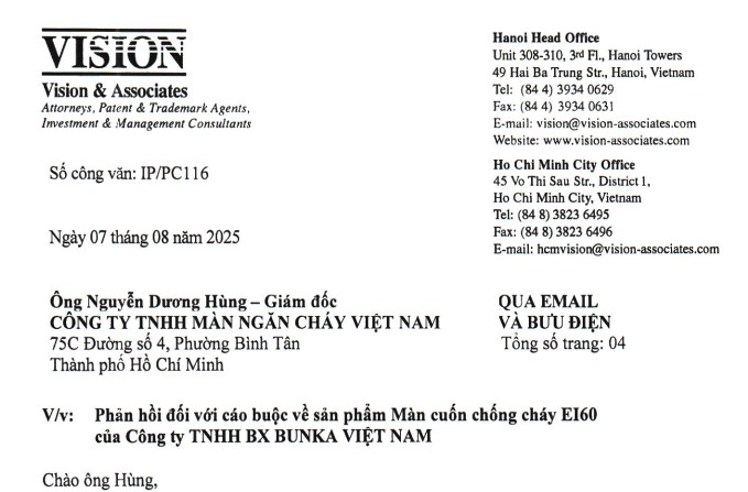 Sau khi Công ty TNHH Màn Ngăn Cháy Việt Nam (VFC) phát đi thư cảnh báo về nghi vấn xâm phạm sáng chế số 48706, Công ty TNHH BX Bunka Việt Nam (BX) đã thông qua Công ty TNHH Tầm nhìn và Liên Doanh (Vision & Associates) gửi phản hồi ngày 07/08/2025. Văn bản này đưa ra nhiều lập luận và khẳng định sản phẩm của BX hoàn toàn tuân thủ các quy định hiện hành.