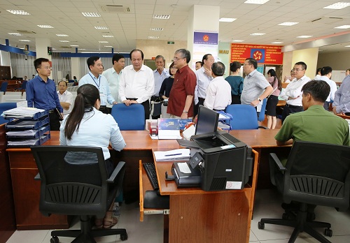 | Bộ trưởng, Chủ nhiệm Văn phòng Chính phủ Mai Tiến Dũng kiểm tra hoạt động của Trung tâm hành chính công tỉnh Cà Mau. Ảnh: VGP/Mạnh Hùng |