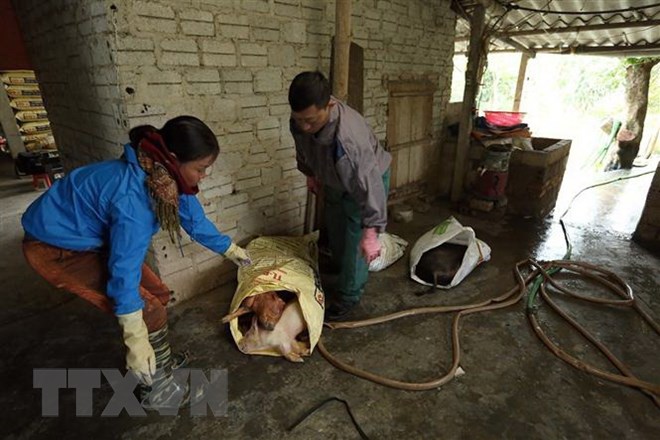 | Người dân cho lợn chết vào bao tải để đem tiêu hủy. (Ảnh: Phan Tuấn Anh/TTXVN) |