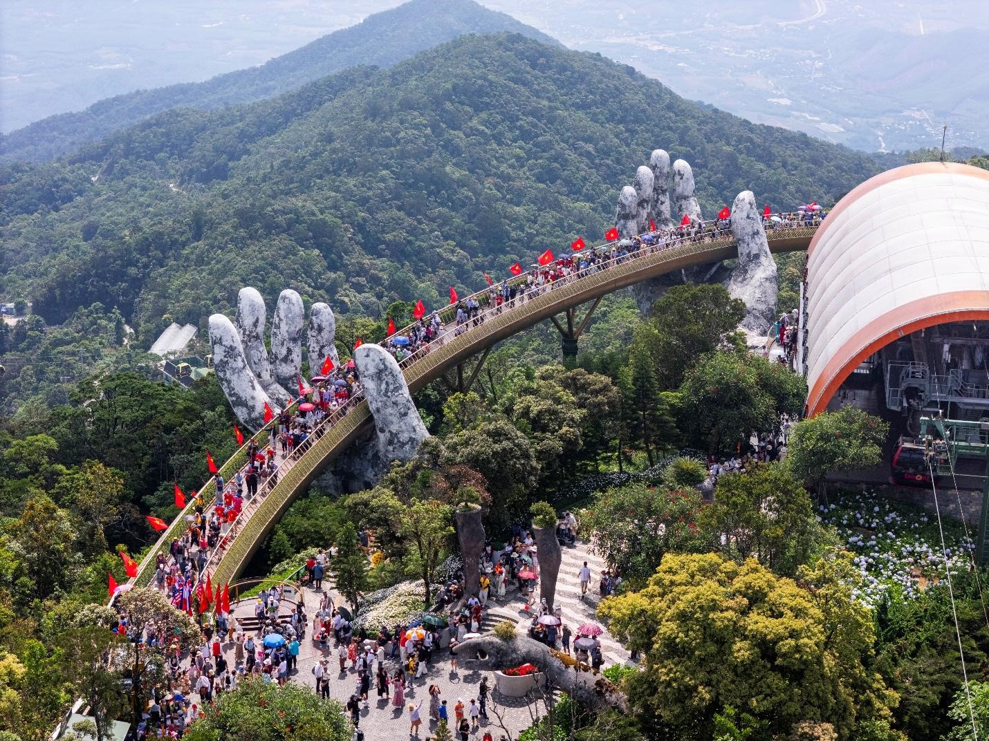 Khung cảnh rực rỡ của Cầu Vàng khiến đông đảo du khách thích thú, hào hứng check in.