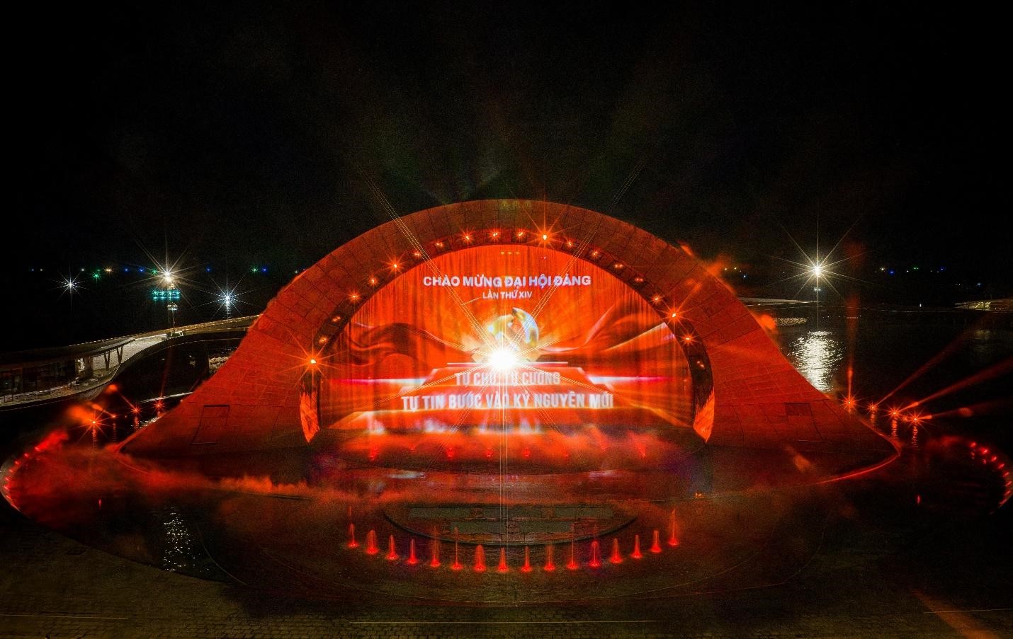 Màn hình lớn của show “Kiss of The Sea” dịp này cũng trang trọng thể hiện tinh thần chào mừng Đại hội Đảng lần thứ XIV.