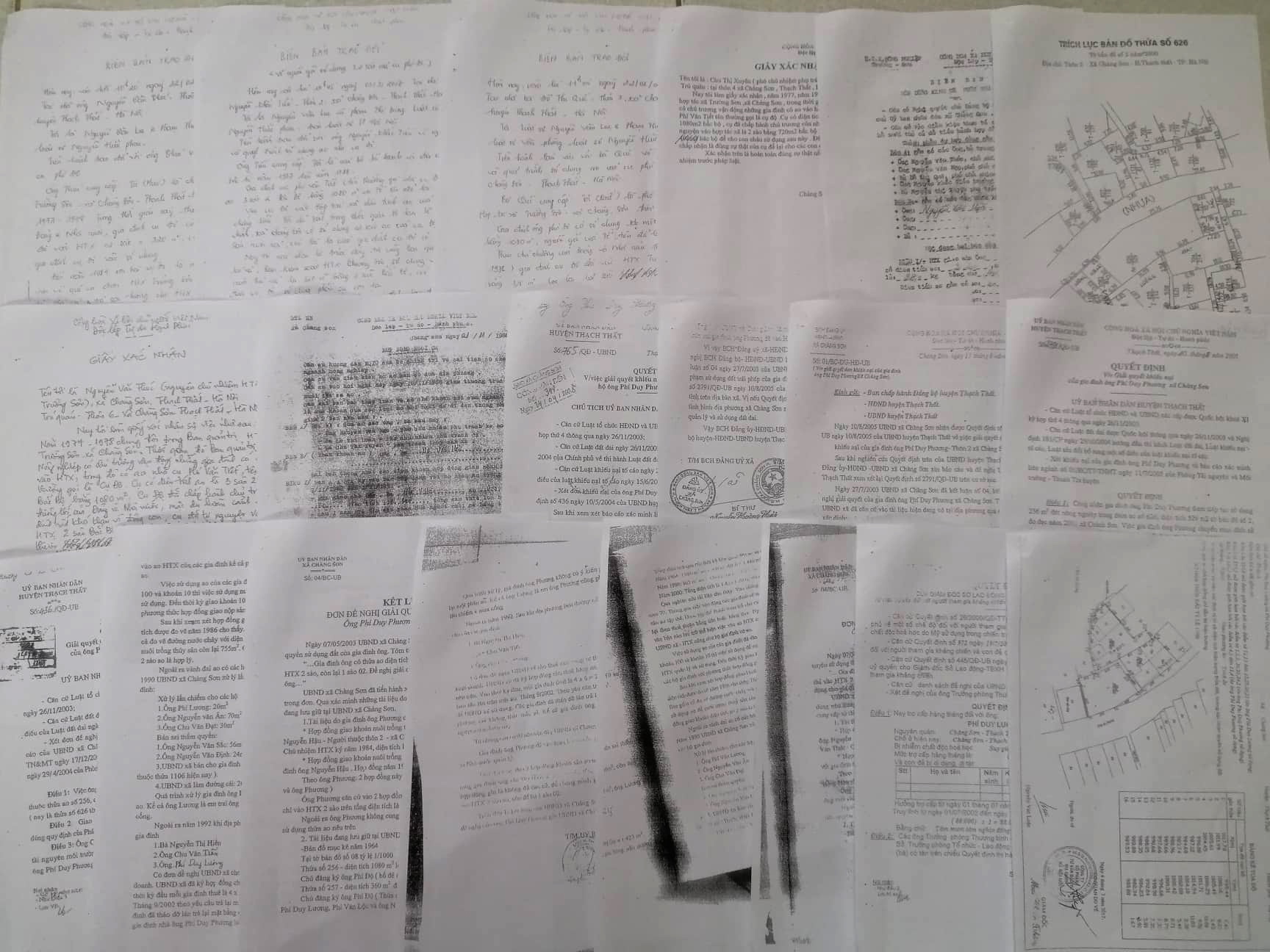 + Ngày 10 tháng 5 năm 2004, UBND huyện Thạch Thất ban hành Quyết định số 436/QĐ – UB, trả lời việc gia đình ông Phí Duy Phương đòi lại quyền sử dụng 3,2 sào Bắc Bộ của thửa đất số 256 thuộc tờ Bản đồ số 8, đo đạc năm 1964 là không có căn cứ;
