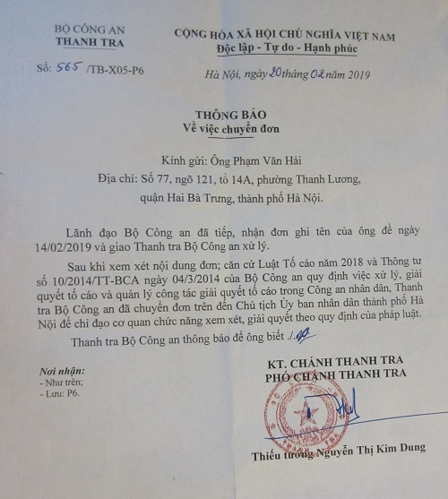 Thông báo chuyển đơn số 565/TB-X05-P6 ngày 20/2/2018 do Thiếu tướng Nguyễn Thị Kim Dung, Phó Chánh Thanh tra Bộ Công an ký