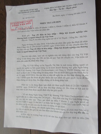 “Sau khi tiếp nhận, xem xét và nghiên cứu nội dung đơn của ông Vũ Việt Hồng và nội dung công văn 299, tài liệu do quý Tạp chí chuyển tới, Viện kiểm sát nhân dân quận Ba Đình thấy rằng:
