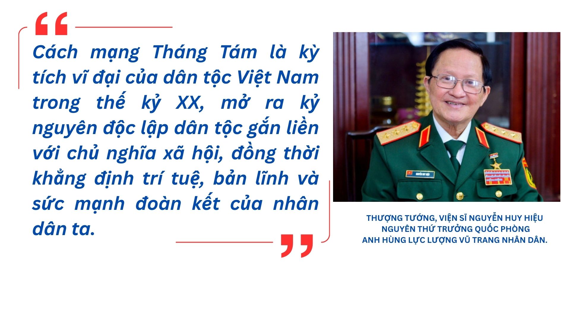 Tám mươi năm đã trôi qua, nhưng ánh sáng Cách mạng Tháng Tám vẫn rực rỡ, soi đường cho dân tộc ta trong sự nghiệp xây dựng và bảo vệ Tổ quốc. Đó là ánh sáng của niềm tin, của ý chí tự lực, tự cường, của khát vọng độc lập và phồn vinh. Như Thượng tướng Nguyễn Huy Hiệu khẳng định, “Thắng lợi của Cách mạng Tháng Tám không chỉ là niềm tự hào của dân tộc, mà còn là nguồn động lực để mỗi thế hệ người Việt Nam hôm nay và mai sau tiếp tục nỗ lực phấn đấu, đưa đất nước ngày càng phát triển, vững bước trên con đường hội nhập và khẳng định vị thế trên trường quốc tế.”