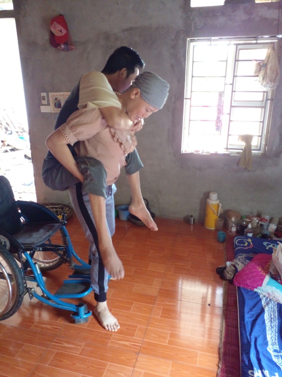 Chị Bùi Thị Hoa (37 tuổi, sống ở bản Tà Phù, xã Liên Hoà, huyện Vân Hồ, tỉnh Sơn La). Năm 2016, chồng chị - anh Hoàng gặp tai nạn, sống cảnh tàn tật: bị liệt tủy dẫn tới teo hai chân do chấn thương quá nặng.