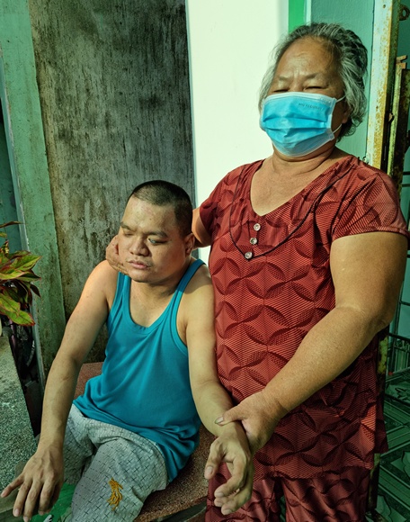 Bà Tím bên cạnh con trai tật nguyền, tâm thần (Ảnh: Báo Vĩnh Long)
